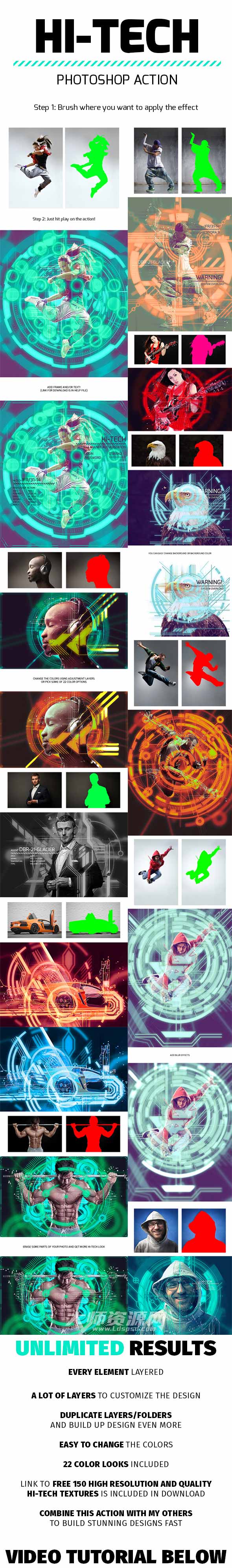 Create professional, hi-tech effects from your photos with no work at all. Action is very simple to use and you can use ANY textures to create completely unique design! Link to free 150 high resolution and quality textures is included in download.