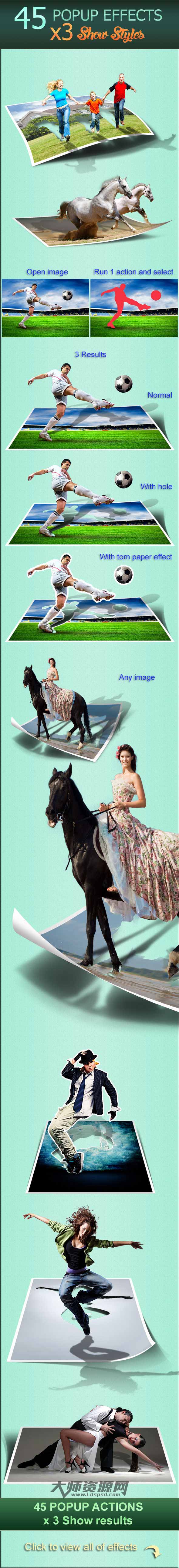 45 Popup Photo Effect is a package of 45 actions x 3 show results. Popup action create a popup image from your photo, perpective view of image, curl and shadow for any image. With an action for three results: Normal, Popup with hole in base, Popup with torn paper effect and hole in base.