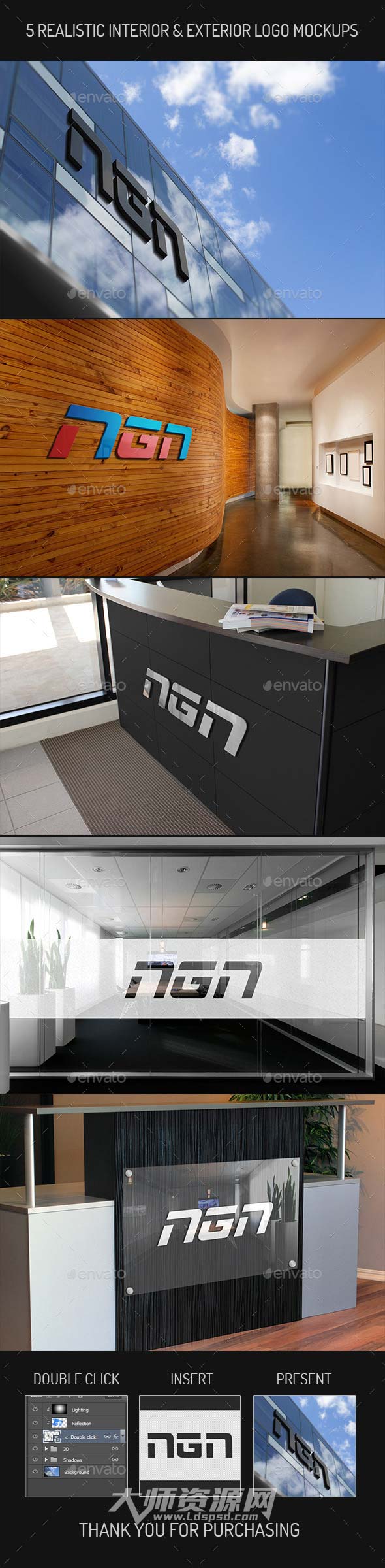 5个逼真的标志展示模型:5 Realistic Interior & Exterior Logo Mock-ups