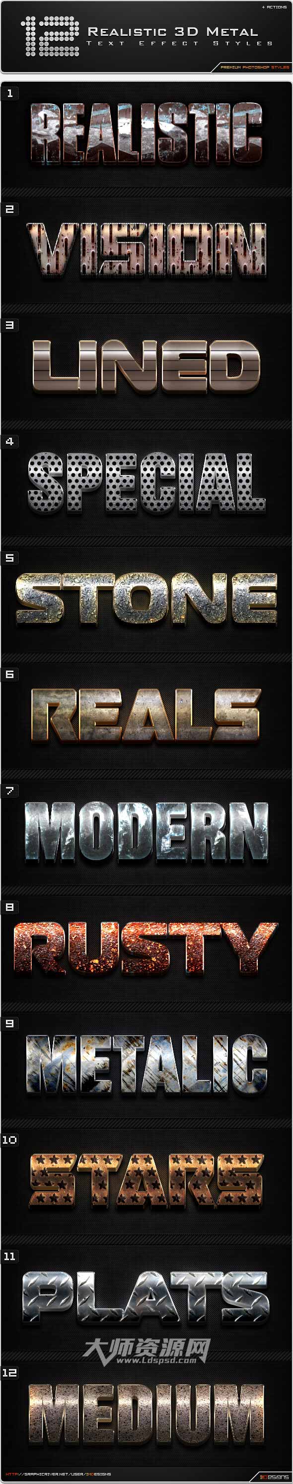 PS图层样式-12个极品的3D金属文本样式:12 Realistic 3D Metal Styles + Actions