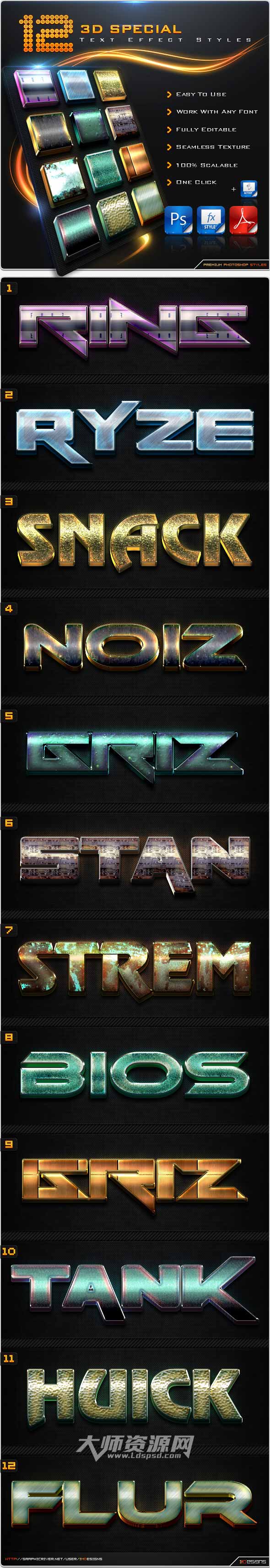 PS图层样式-12个极品的3D金属文本样式:12 Special 3D Text Effect Styles