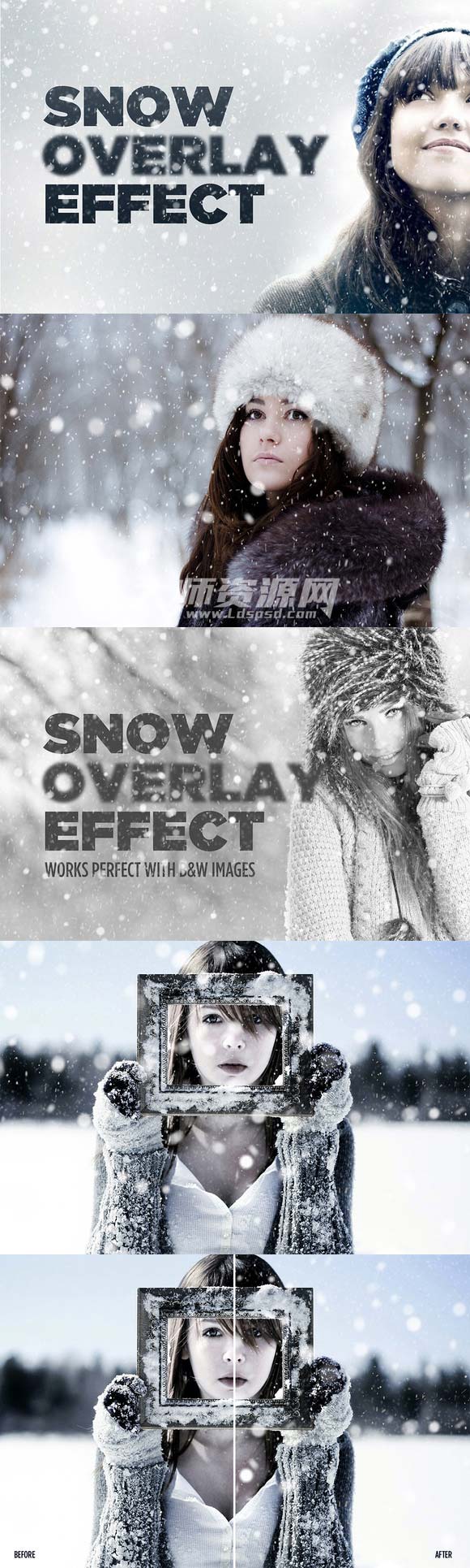 Snow Overlay Effect. This product add real show effect over your images. The effects includes 5 different overlays layers. Also you can combine the layers to create new and unique snow effects.