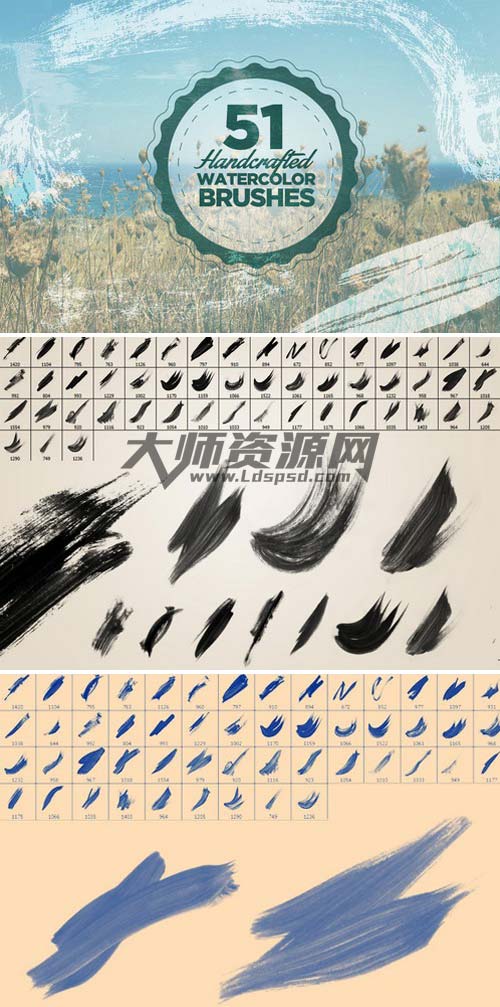 51个毛笔墨迹效果的PS笔刷:51 Handcrafted Watercolor Brushes