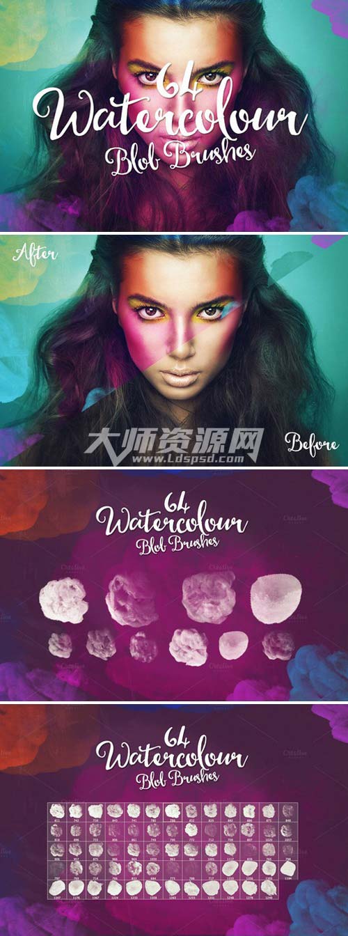 64个水彩墨点效果的PS笔刷:64 Watercolor Blob Brushes