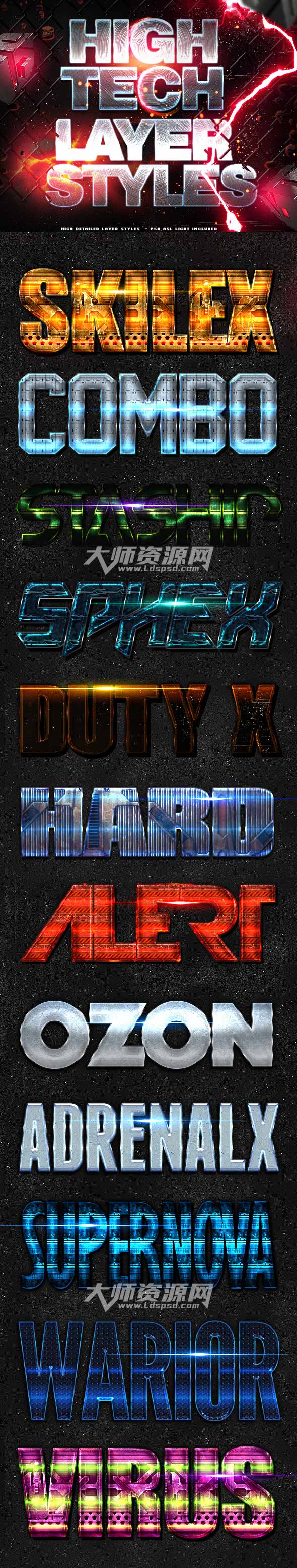 High Tech Styles to add amazing look to your artworks the pack comes with: -PSD FILE with the preview shown (flares and elements included) -ASL FILE with the styles shown -README file to show how to use and the font used