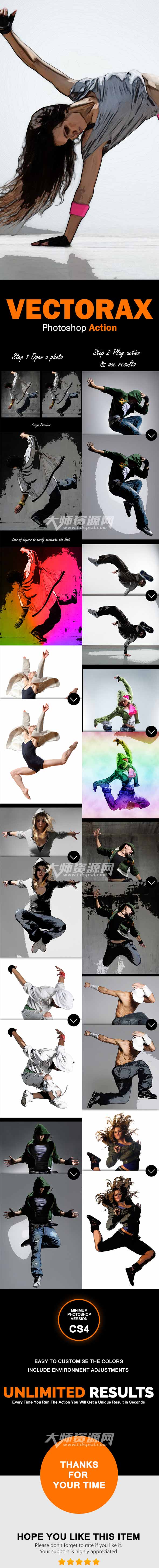 This action quickly transforms your photos into Vector artwork. Give your photo’s an artistic edge with this action. Simply open up a photo and click play on the action. Create this highly detailed effect from your photos with little effort at all.The action has been tested and working on Photoshop CS6,CC+