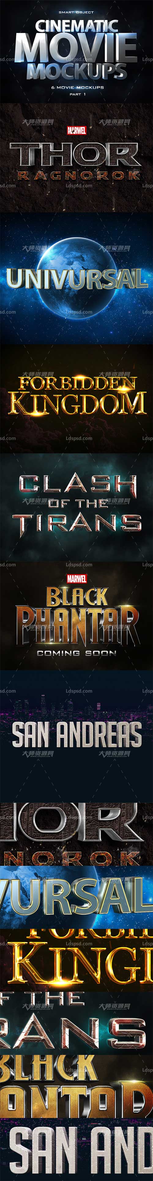 6个电影片头3D文字模板(含PS样式):Cinematic 3D Movie Mockups V2