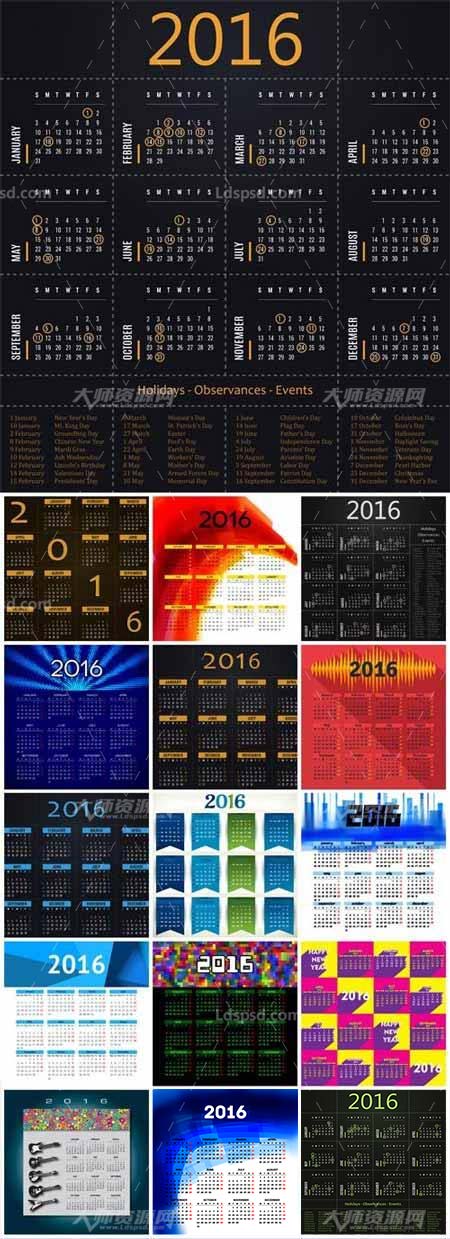 Vector calendar 2016 with dates of holidays,16套矢量的2016日历模板