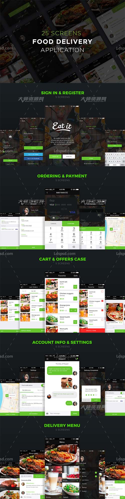 The simple layout of the app ‘Eat it’ makes the ordering process incredibly easy. It is perfect, fresh and stylish UI Kit for building your own food delivery app. All components are vector based, fully compatible, editable and pixel perfect. Create new sections instantly and make a beautiful and unique layout for any desirable topic. ‘Eat it’ has been developed for those who know everything about design and delivery. The most popular UX solutions and 25 PSD files include:
