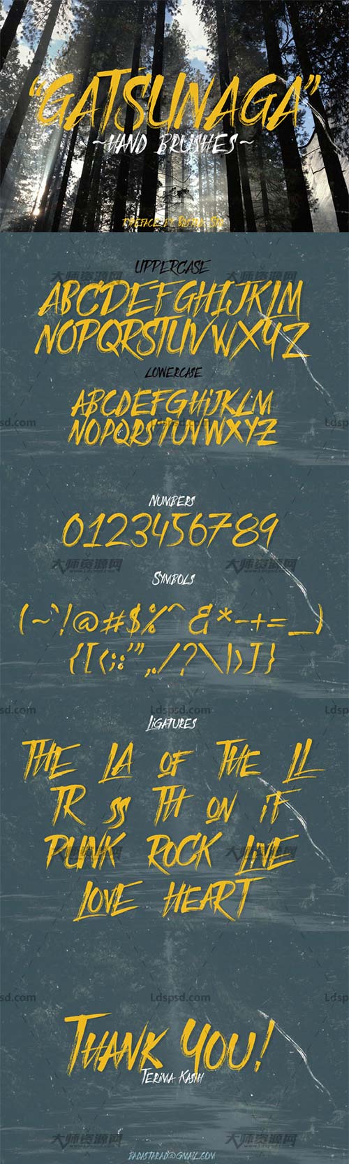 Gatsunaga Hand Brushes dedicated to a design depicting a strength and speed. But did not rule, this typeface design can be used for other needs, such as music concerts, movie posters, book covers, t-shit, and so forth.