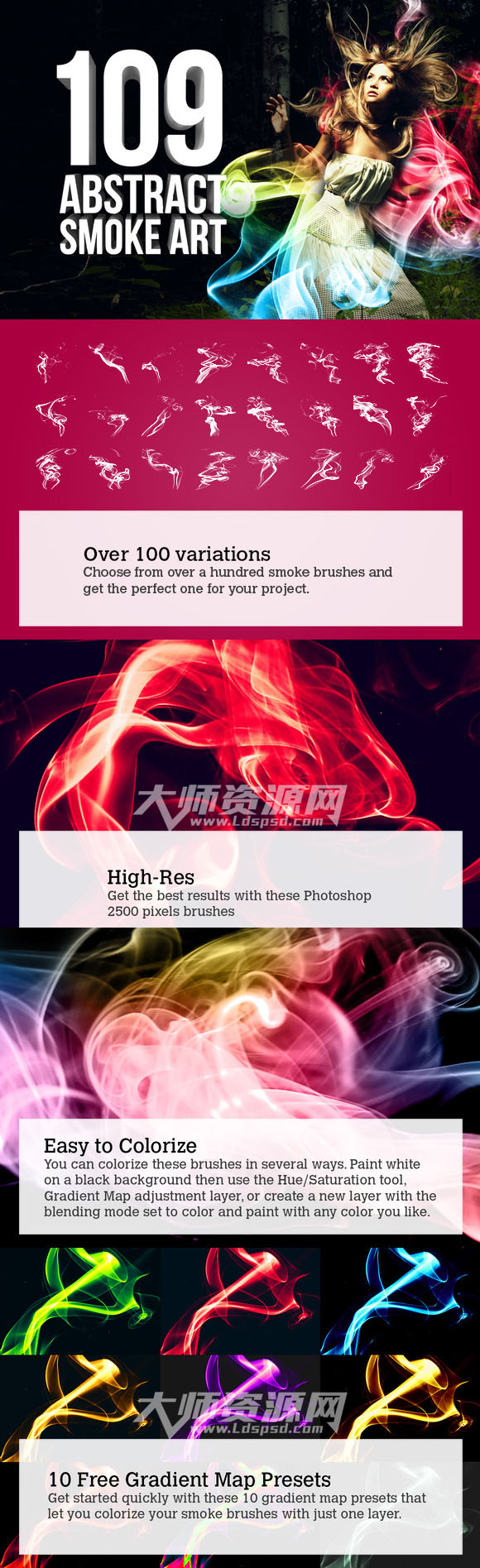 These brushes are extremely easy to use. Just paint a smoke brush on a black layer then colorize it with the Hue/Saturation tool or by adding a Gradient Map adjustment layer and using one of our free smoke gradients.