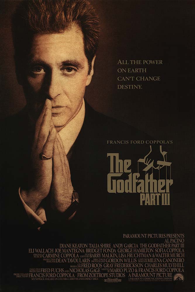转眼间已经是1979年,第二代教父麦克•柯里昂(阿尔•帕西诺 饰)到了垂暮之年,为了灵魂的救赎,麦克慢慢结束家族的黑道事业,转投正当生意。麦克的儿子托尼酷爱艺术,无意接手家族事业,迈克尔决定让大哥逊尼的私生子,火爆好色的文森(安迪•加西亚 饰)继承家业,当第三代教父。麦克的爱女玛丽(索菲娅•科波拉 饰)和文森相恋,遭到父亲的反对,父女渐渐疏远。为了使家族资产合法化,麦克通过在梵蒂冈教廷的关系网,准备投资“屹立”集团,却遭到敌人的暗中阻挠,教皇的去世也让事情更加扑朔迷离。麦克无奈之下,只能重新选择用暴力解决问题,他的亲人也被卷入了这场血雨腥风。