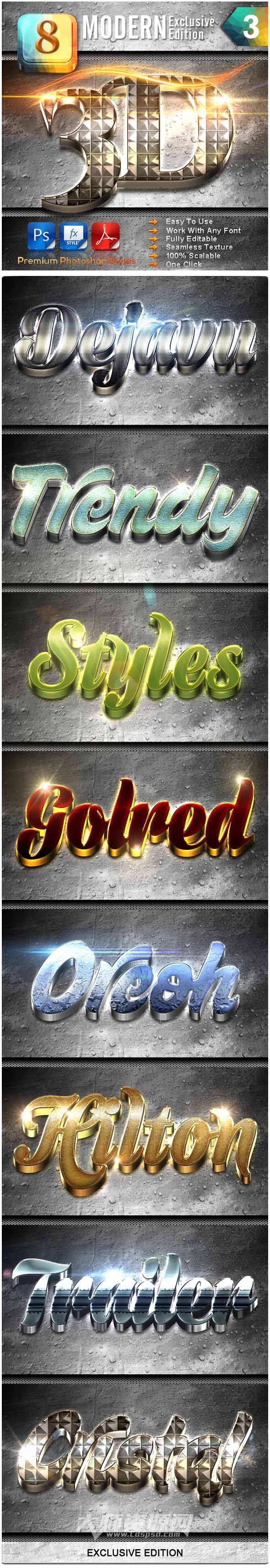 8 Modern 3D Exclusive Edition Vol.3,PS图层样式-8个时髦的3D文本特效(第三分卷)