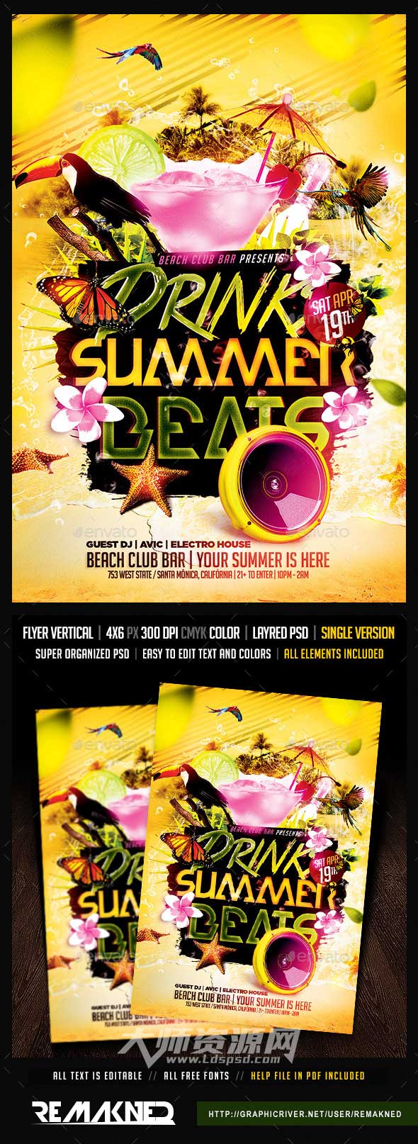 夏日酒会传单模板:Drinks Summer Beats Flyer Template PSD