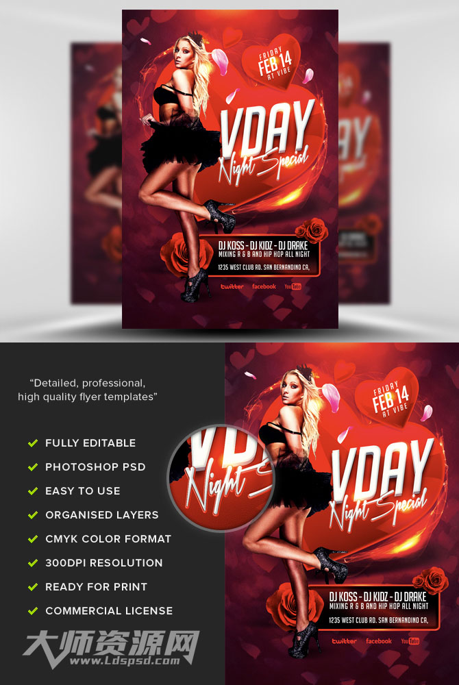 VDAY Night Special Flyer Template,情人节聚会,情人节晚会,传单模板,海报模板