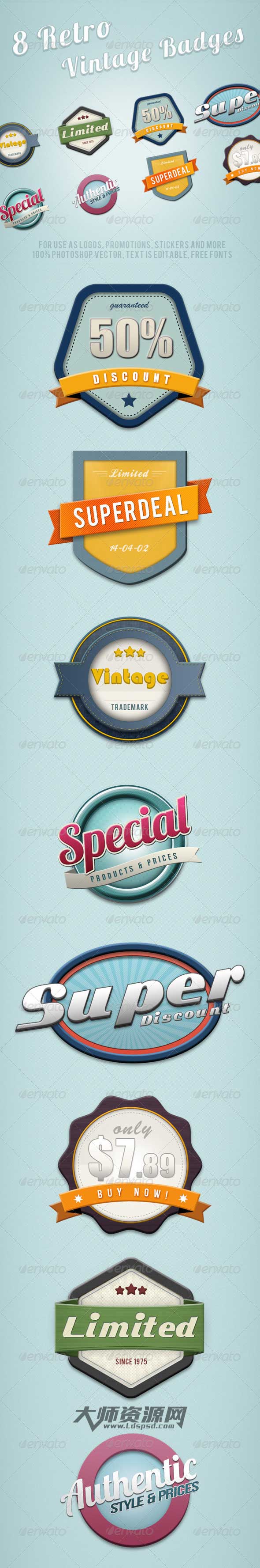 Another great collection of 8 vintage badges you can use for your website, logo stickers, promotions, advertising etc.Also checkout my 6 Retro Vintage Badges