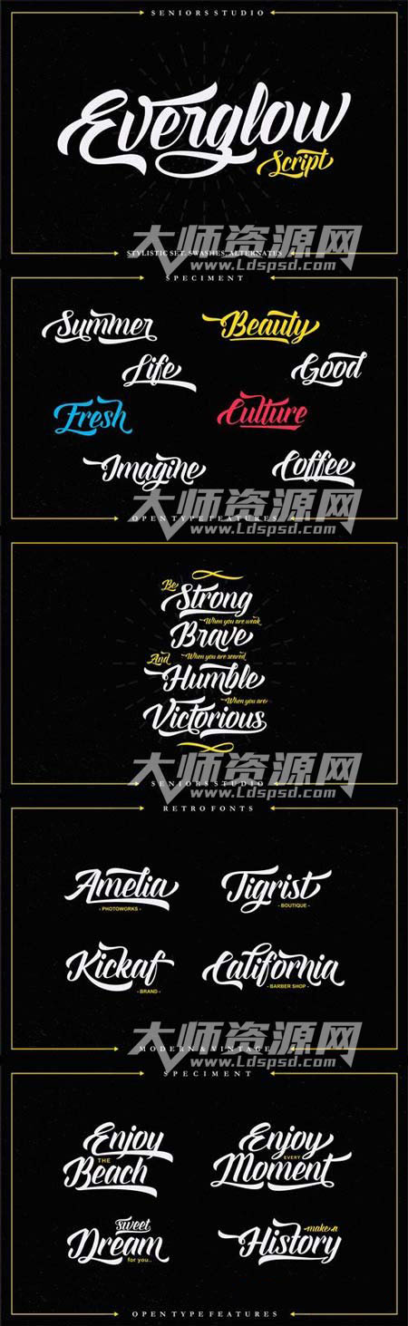Everglow is a Script Retro font. a bold, classic,and fun vintage script. With almost 560 glyphs and and 322 alternative characters, contain with opentype features. Stylistic alternates, Ornament, swash and more. can be used for various purposes.such as logos, wedding invitation, t-shirt, letterhead, signage, news, posters, badges etc. To enable the OpenType Stylistic alternates, you need a program that supports OpenType features such as Adobe Illustrator CS+, Adobe Indesign & CorelDraw X6-X7.