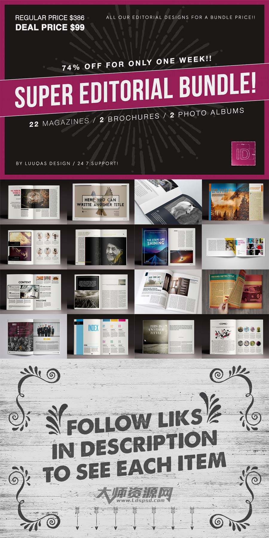 26套杂志画册影集indesign模板合集:Super editorial bundle