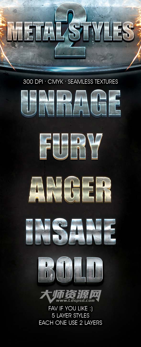 New Metal Layer Styles Pack, This time 5, each one using two layers, more bold, steel and aggressive. This time styles are: Unrage, Fury, Anger, Insane and Bold.