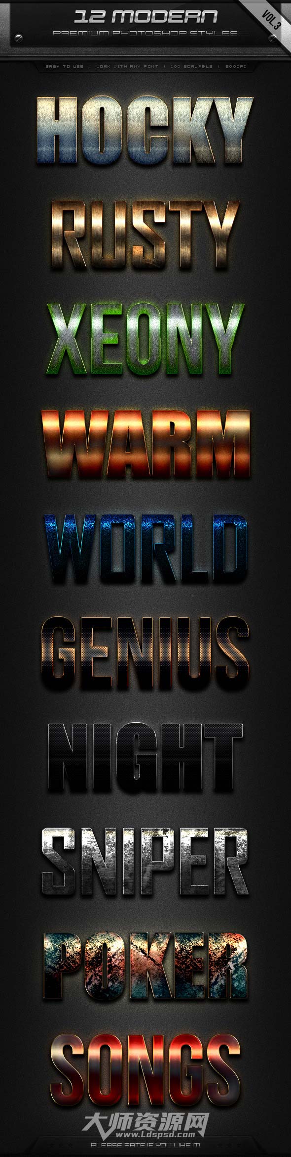10个金属质感逼真的PS图层样式:10 Modern Styles Vol.3